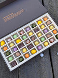 Ingredienser: Kakaomassa, socker, helmjölkspulver, smör, grädde, glykos, trimolin, mango, citron, lime, passionsfrukt, hallon, lakrits, kokosolja, mandel, hasselnöt, pistage, salmiak, kokos, kaffe, emulgeringsmedel: solroslecitin, rapslecitin, kryddor, pektin, citronsyra, alkohol, kakaofärg, (i ägglikörägget; ägg) (i key lime paj; vetemjöl, solrosolja, bakpulver) (i xantépralinen; vetemjöl, gelatin)