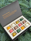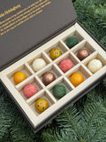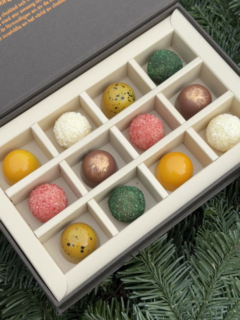 En cremet hvid chokolade ganache med lidt kardemomme møder en mørk chokolade ganache med mandelmasse, chokoladegryn er støbt i mælkechokolade.